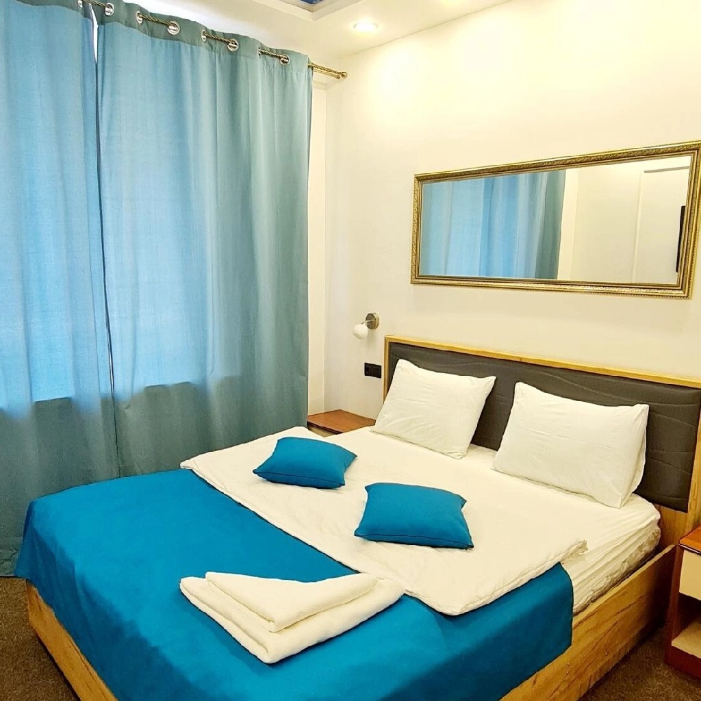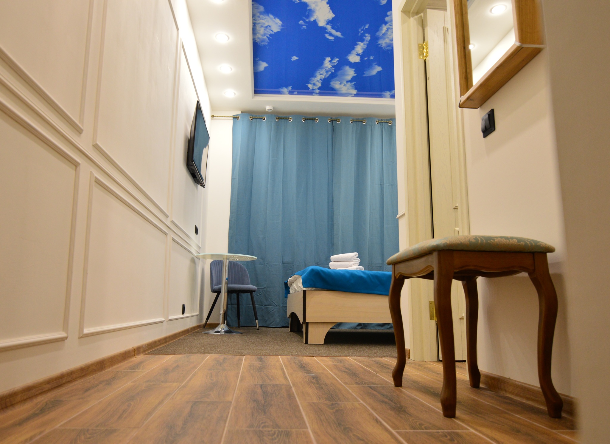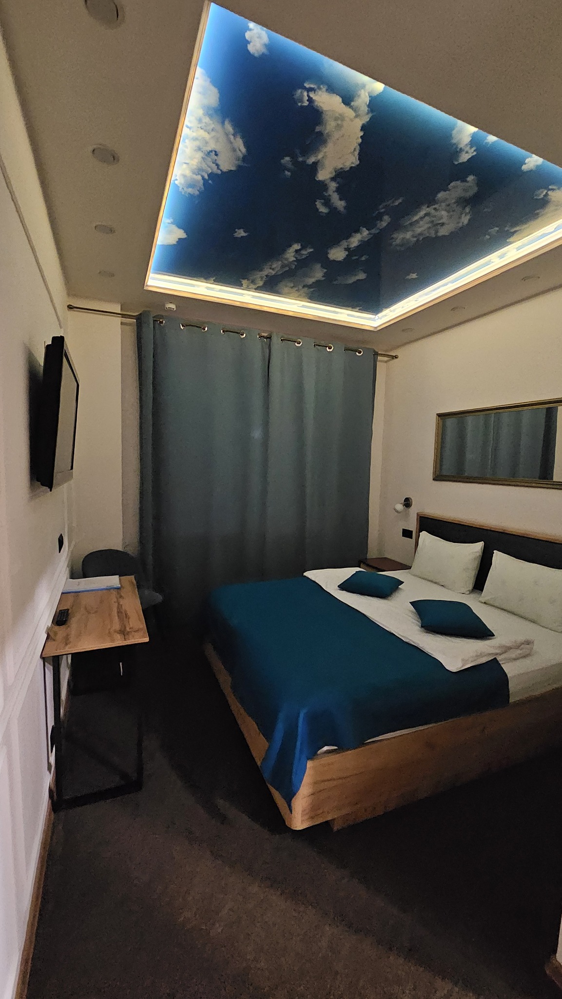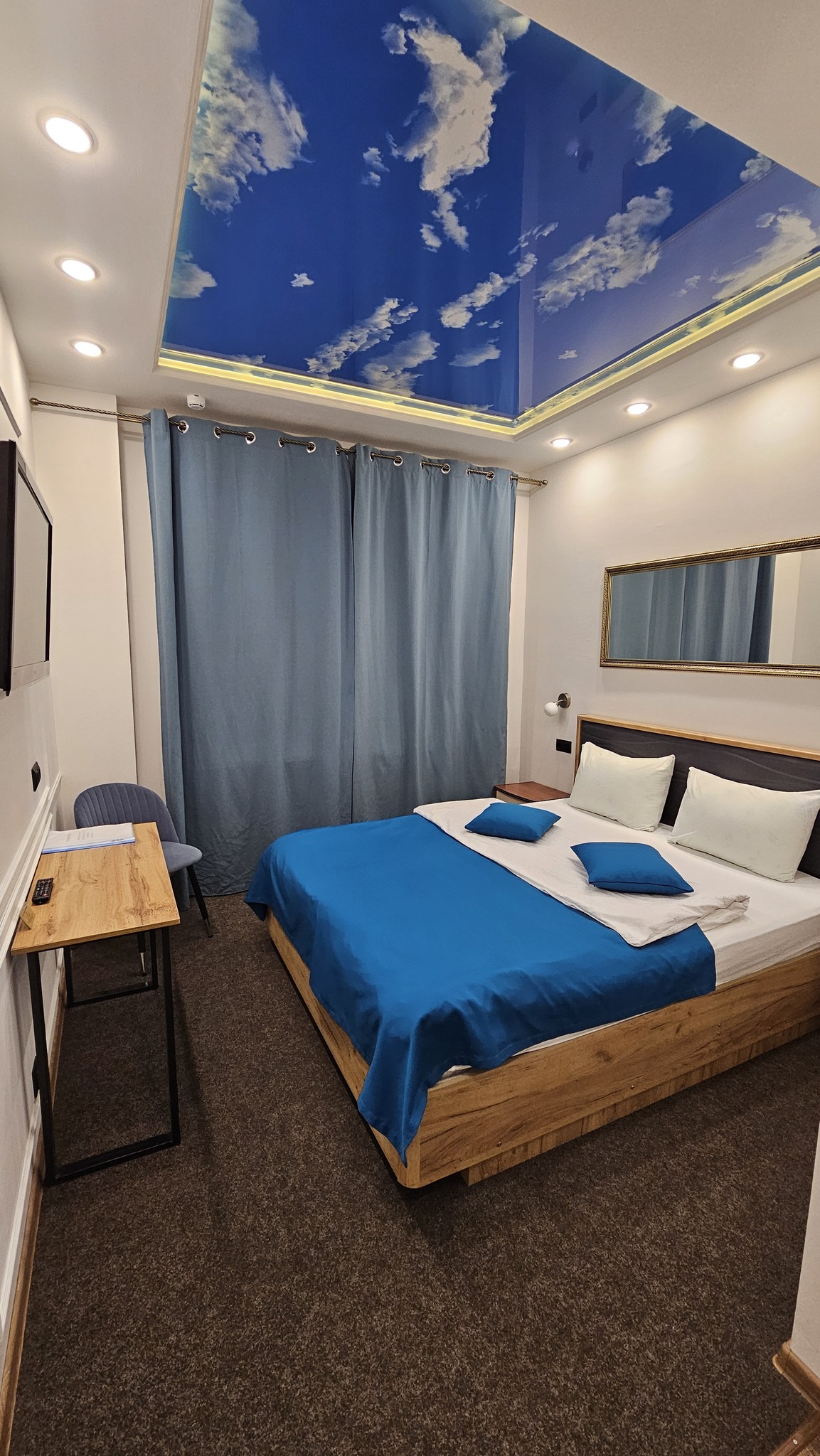 Стильный номер с небом на потолке. В номере большая двуспальная кровать, шкаф, ТВ  65 каналов, wi-fi, сан.узел, душ.